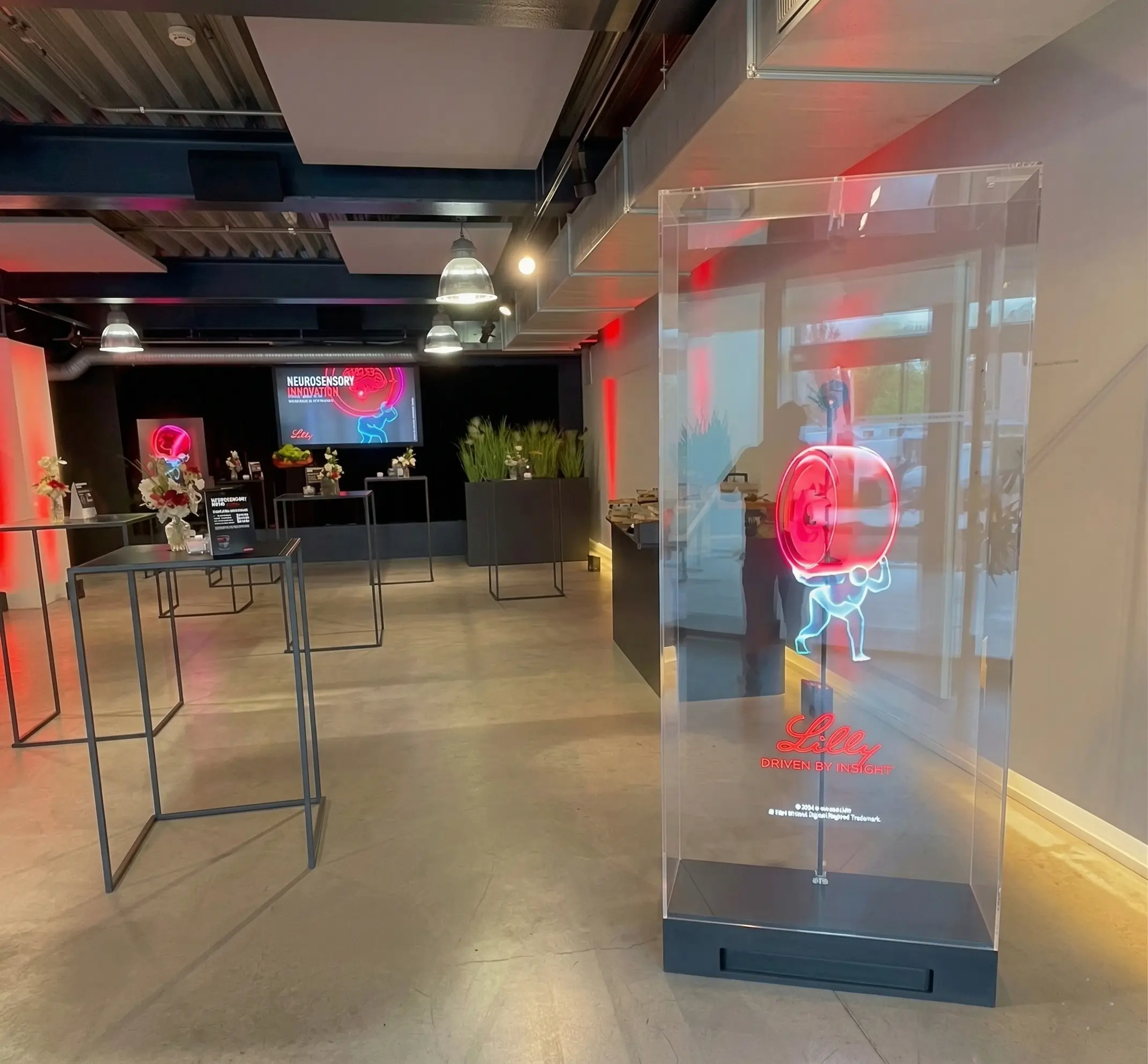 Lilly organisait un congrès scientifique réunissant des spécialistes et professionnels de santé au Quartier Papier à Bruxelles. Dans le secteur pharmaceutique, les congrès médicaux se suivent et se ressemblent souvent : une salle de conférence, des écrans de présentation, des slides projetées. Pour un laboratoire comme Lilly, le risque est de diluer un message scientifique important dans un format que les participants ont vu des dizaines de fois au cours de l'année. L'enjeu allait au-delà du simple décor. Il s'agissait de positionner cet événement comme une référence dans son domaine, en proposant une scénographie à la hauteur du caractère innovant des travaux présentés. La difficulté supplémentaire : le lieu choisi, un loft industriel bruxellois aux volumes imposants, nécessitait un dispositif visuel suffisamment puissant pour habiller l'espace sans surcharger l'environnement ni parasiter les interventions médicales.
