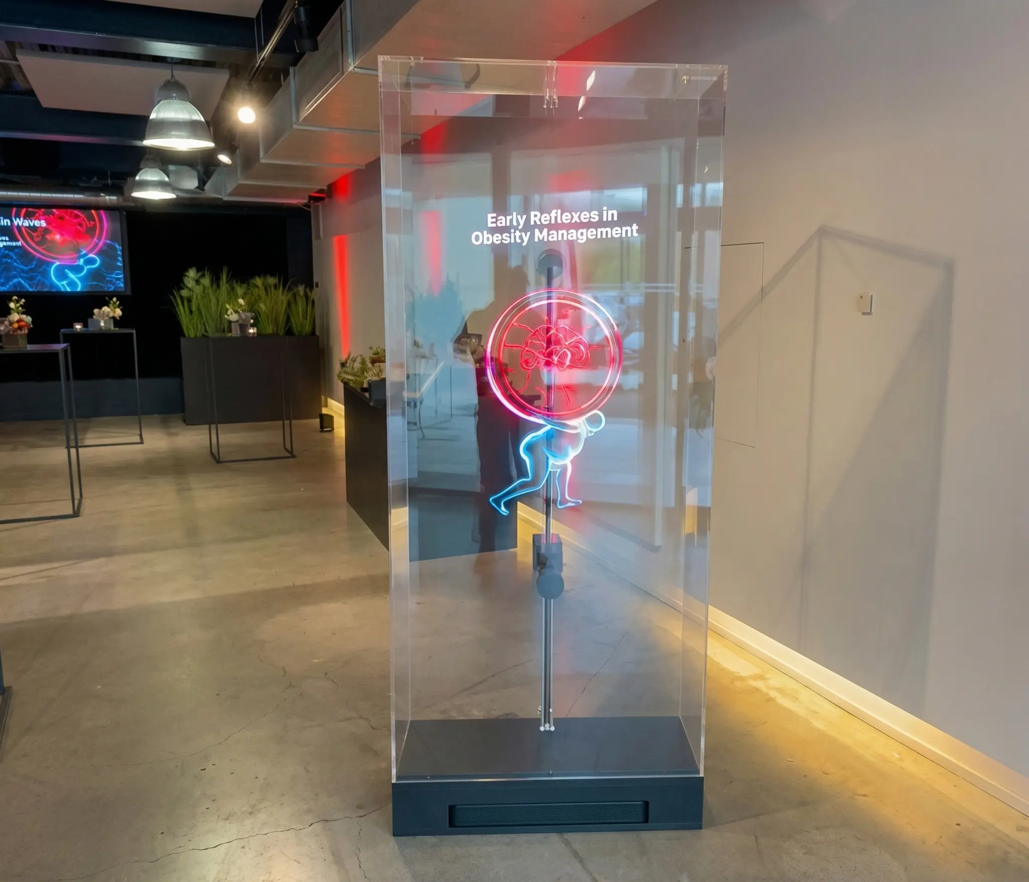 Nous avons déployé deux dispositifs holographiques complémentaires pour structurer l'ensemble du parcours participant, de l'accueil jusqu'à la plénière. À l'entrée de l'espace de réception, nous avons installé un totem holographique en plexiglas transparent, intégrant une hélice holographique protégée. L'animation 3D diffusait une séquence sur mesure mêlant le logo Lilly, la thématique du congrès et des visuels scientifiques stylisés en lévitation. Ce premier point de contact holographique posait immédiatement le niveau d'exigence de l'événement, avant même que les invités ne prennent place en salle. Le format totem transparent s'intégrait naturellement dans l'espace cocktail sans créer de rupture avec l'élégance du lieu. En salle plénière, nous avons positionné des hélices holographiques de part et d'autre de la scène, diffusant des animations brandées aux couleurs de Lilly, synchronisées avec l'éclairage bleu de la salle. Plutôt qu'un simple habillage de fond, ces dispositifs apportaient une profondeur visuelle qui valorisait chaque prise de parole scientifique sans jamais la concurrencer. L'ensemble créait un parcours fluide : le totem holographique captait l'attention à l'arrivée, les hologrammes en plénière prolongeaient l'expérience de marque tout au long du congrès.